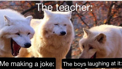 Sticking with the animal trend, we also had the Laughing Wolves. This meme features three wolves: two on the side laughing together and one in the middle displaying an unamused expression. The original photo was of two wolves yawning and the other wolf standing, but with the power of Photoshop, we were able to get this gem.